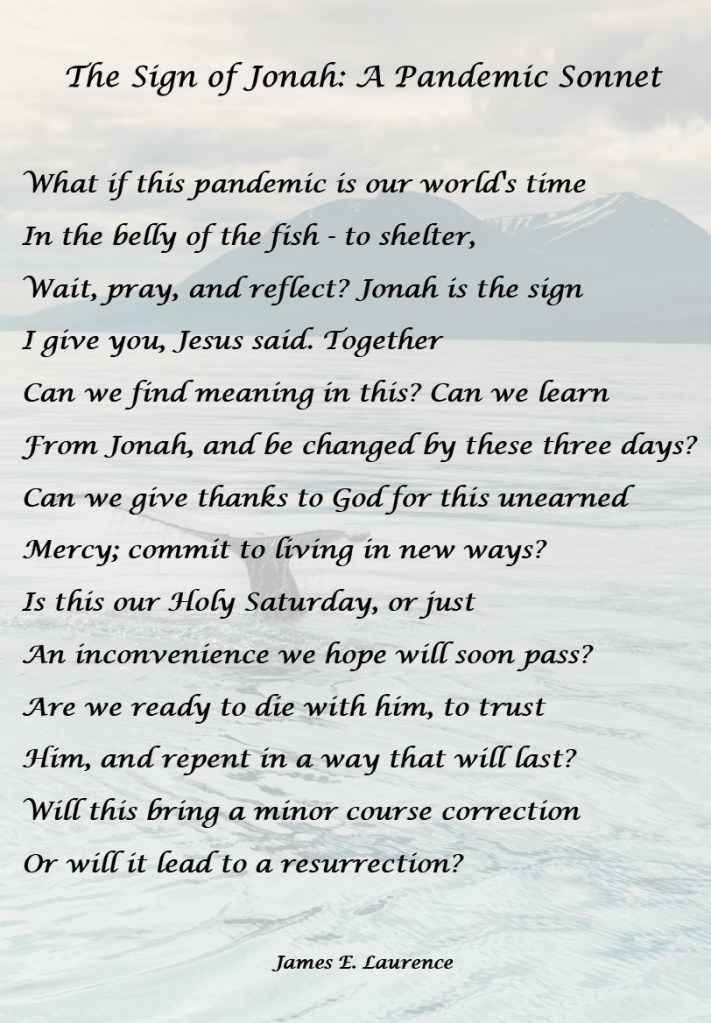 Here we are, in the midst of a world-changing pandemic, in the belly of the fish, in the tomb, receiving this sign of Jonah. The question is, what will we do with it? Here is a sonnet that I wrote as I pondered this very question: