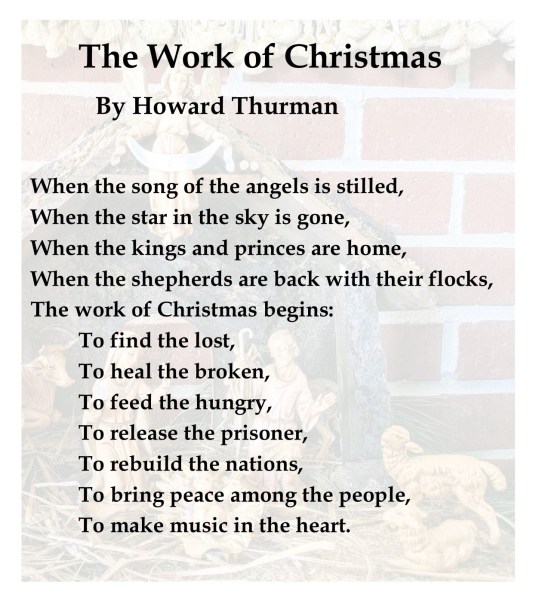 The Work of Christmas by Howard Thurman When the song of the angels is stilled, When the star in the sky is gone, When the kings and princes are home, When the shepherds are back with their flocks, The work of Christmas begins: To find the lost, To heal the broken, To feed the hungry,…