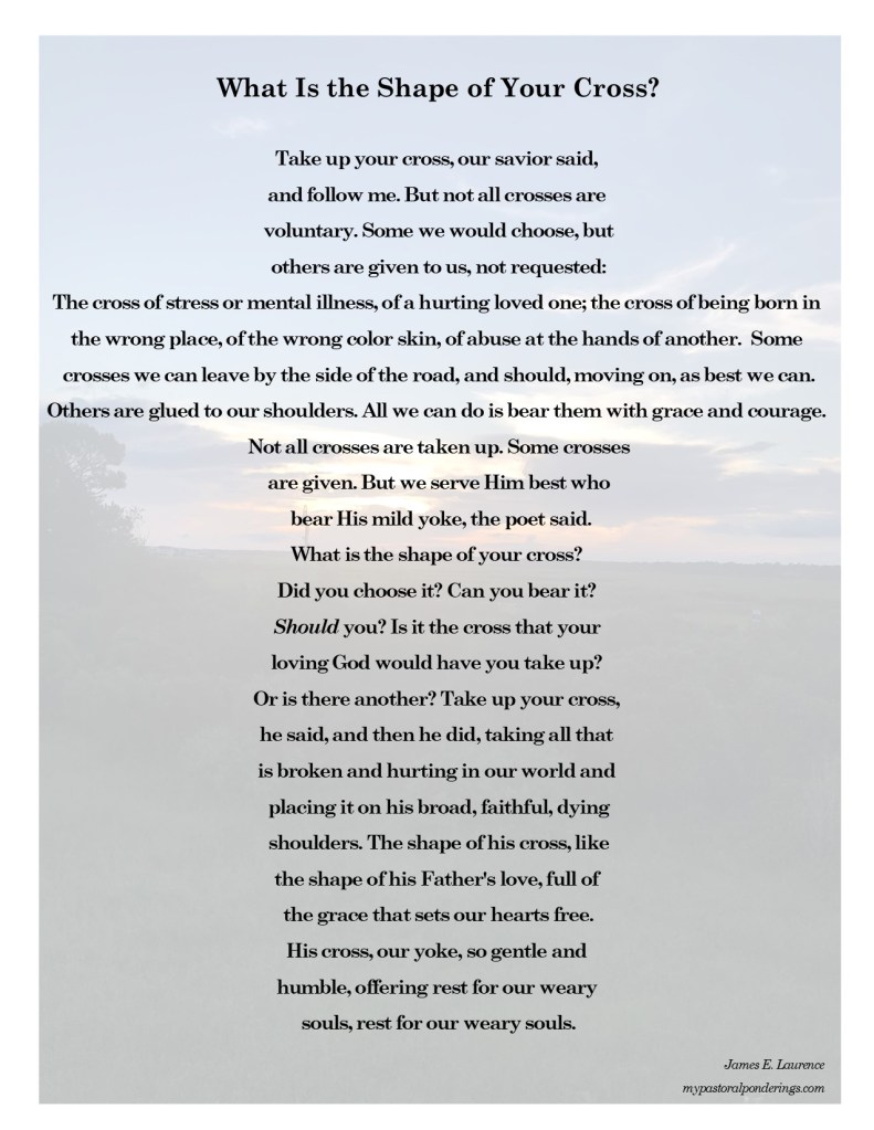 Take up your cross, our savior said, and follow me. But not all crosses are voluntary. Some we would choose, but others are given to us, not requested: The cross of stress or mental illness, of a hurting loved one; the cross of being born in the wrong place, of the wrong color skin, of abuse at the hands of another. Some crosses we can leave by the side of the road, and should, moving on, as best we can. Others are glued to our shoulders. All we can do is bear them with grace and courage. Not all crosses are taken up. Some crosses are given. But we serve Him best who bear His mild yoke, the poet said. What is the shape of your cross? Did you choose it? Can you bear it? Should you? Is it the cross that your loving God would have you take up? Or is there another? Take up your cross, he said, and then he did, taking all that is broken and hurting in our world and placing it on his broad, faithful, dying shoulders. The shape of his cross, like the shape of his Father's love, full of the grace that sets our hearts free. His cross, our yoke, so gentle and humble, offering rest for our weary souls, rest for our weary souls.