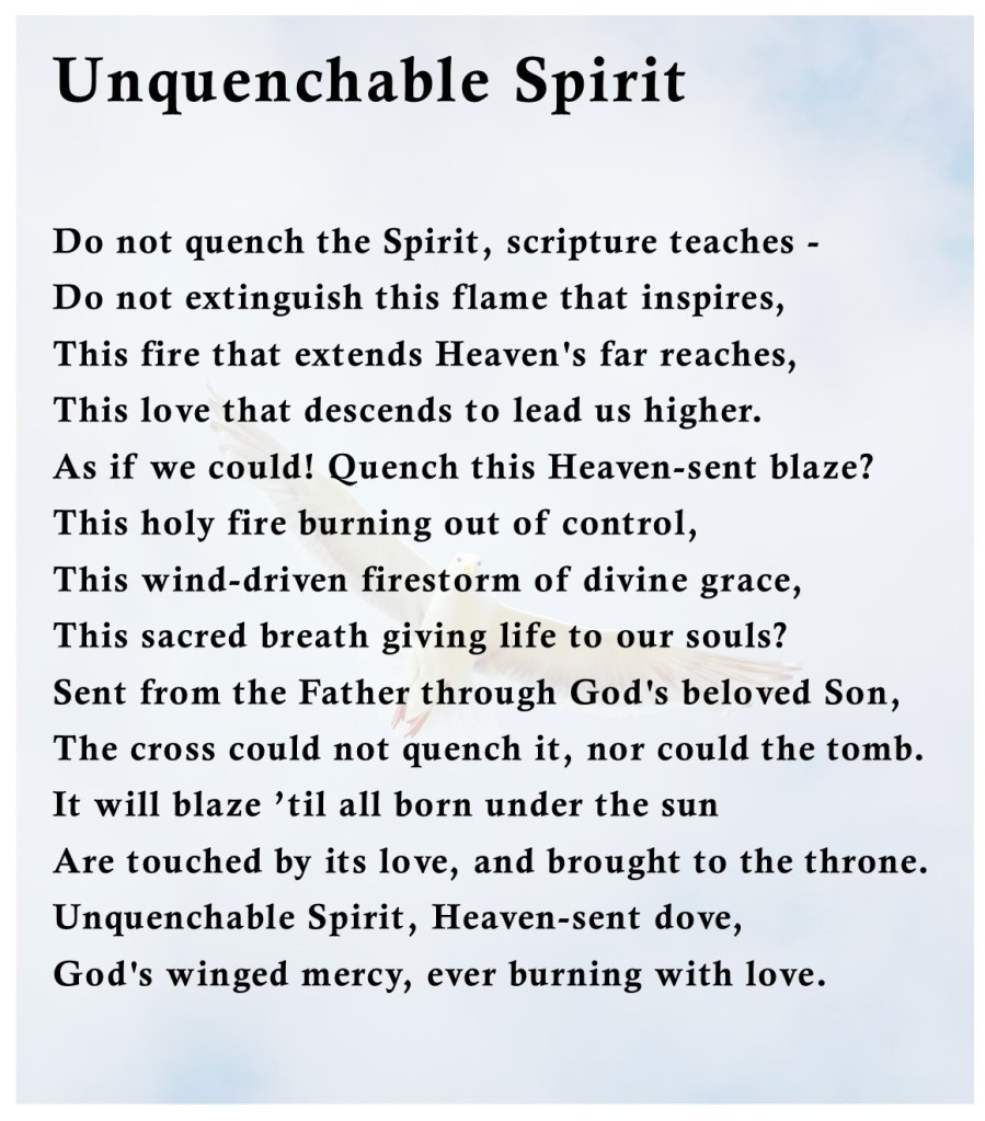 The more I thought about those words, “do not quench the Spirit,” the more I wondered how it would even be possible?! We might, in our own lives, extinguish the Holy Spirit, which is what I think is the nature of Paul’s warning. But the Holy Spirit cannot be driven from this world. And the good news of Jesus Christ will continue to be shared by his Spirit-filled followers until his glorious return. Thanks be to God!
