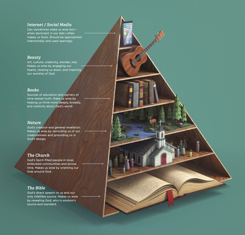 The Bible – “If we are to become wise, our information diet must begin with the Bible. It must be our solid foundation, as well as the grid through which all other sources are tested … Tragically, our Wisdom Pyramids are often upside down. What should be the base level—God’s eternal word—is often relegated to the ‘use sparingly’ top. Meanwhile, what should really be at the ‘use sparingly’ top—man’s ephemeral words (i.e., social media)—often occupies our foundation. And we wonder why we are going crazy.”
