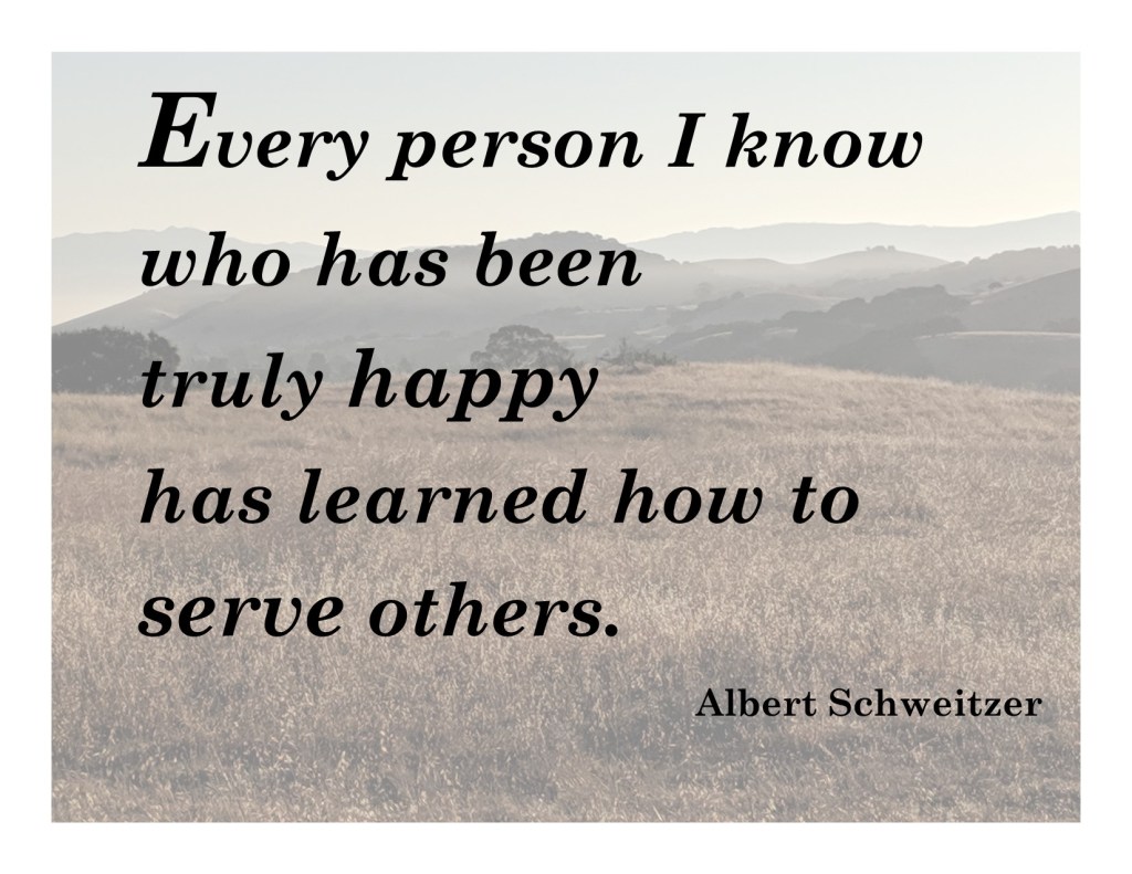 But what strikes me about Albert Schweitzer, more than his many accomplishments, is that he discovered the wonderful secret of the Christian life – that we are called not to be served, but to serve. And that when we live with this desire to serve others, we find happiness, meaning and fulfillment that we cannot get by being served. Albert Schweitzer summed this up in a famous quote of his:
